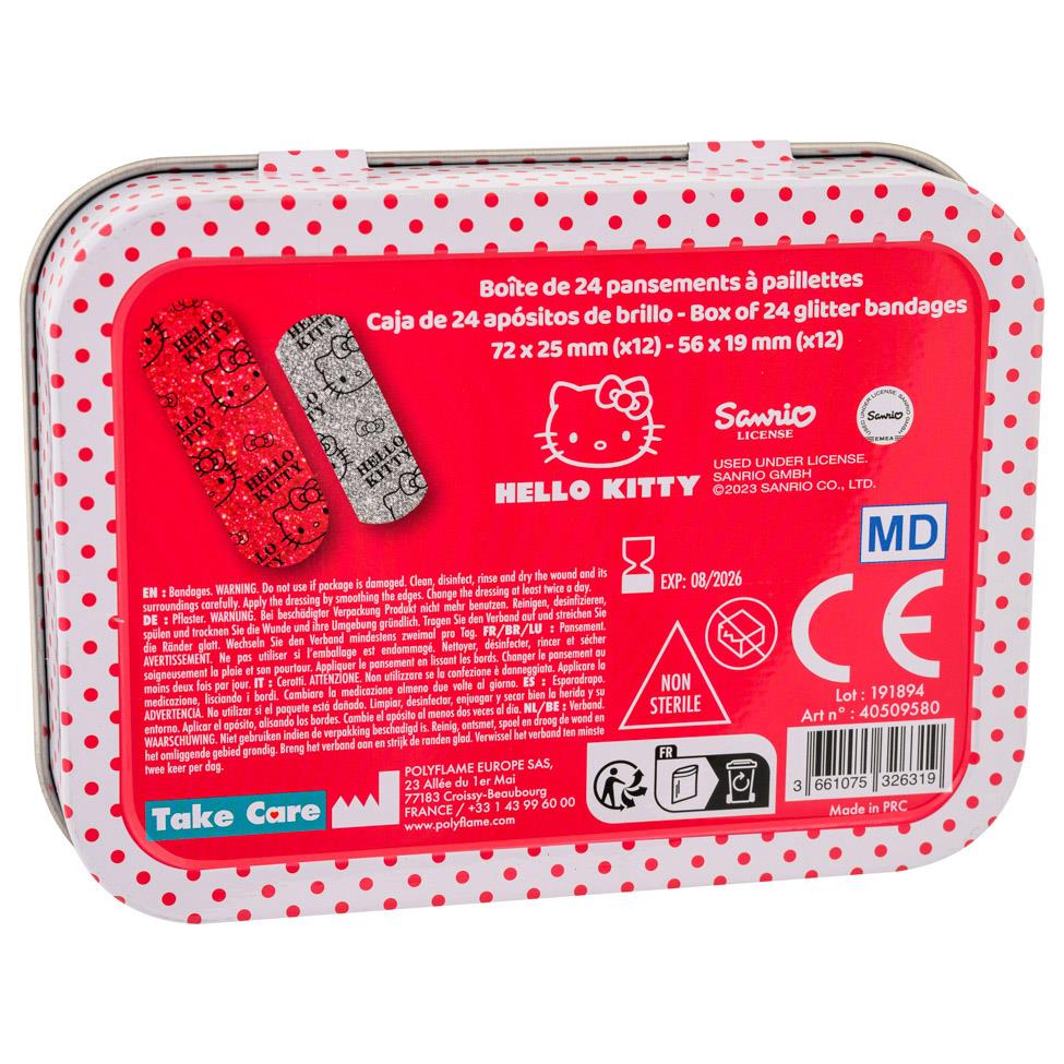 Hello Kitty Glitter Bandages (Red & Grey) are a charming and practical way to cover minor cuts and scrapes. The box contains 24 adhesive bandages in two sizes: 72 x 25mm (12 pieces) and 56 x 19mm (12 pieces). Adorned with delightful Hello Kitty designs and a touch of glitter, these bandages add a bit of fun and style to first aid. The durable adhesive ensures a secure fit, while the soft material is gentle on the skin. Perfect for Hello Kitty fans of all ages, these bandages combine functionality with a playful aesthetic.