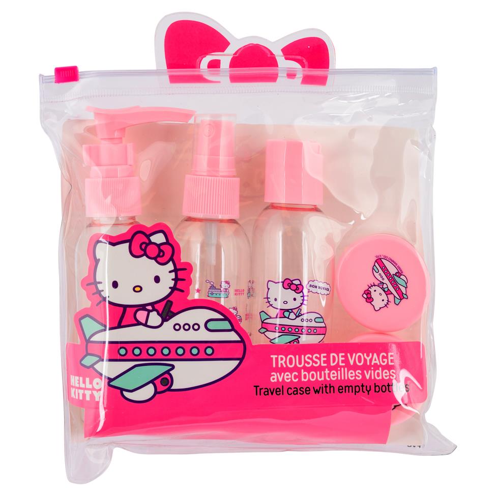 Travel in style with the Hello Kitty Toiletries Travel Set. Featuring adorable Hello Kitty-themed containers and accessories, this compact kit includes essentials like bottles, jars, and a toiletry bag—perfect for organising your skincare and hygiene products on the go. Lightweight and convenient, it’s ideal for weekend getaways, business trips, or everyday use. A fun and practical gift for Hello Kitty fans of all ages. This travel set includes: 1 Pouch, 1 Flacon pour lotions (50ml), 2 Jars for cream (10ml), 1 Spray bottle (50ml), 1 Bottle for creams (50ml). Materials: PET - PP - PG33 - PVC.